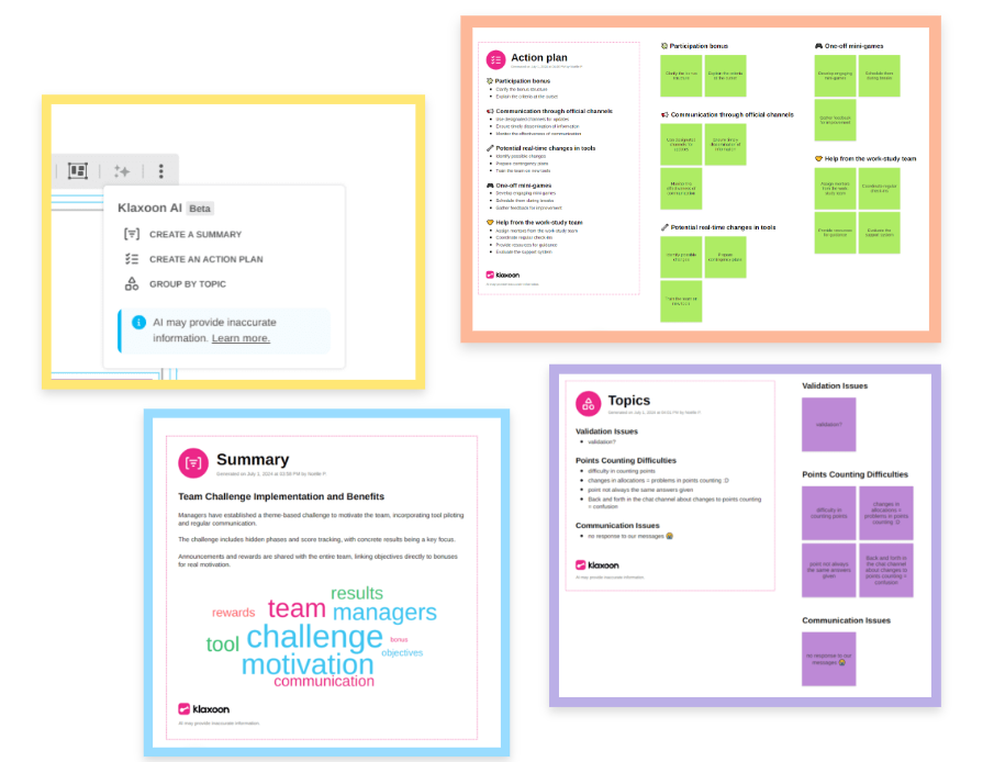 Harness the full potential of AI to enhance your ideas and texts on Board, extracting key information, grouping it by topics, and creating action plans to drive progress.