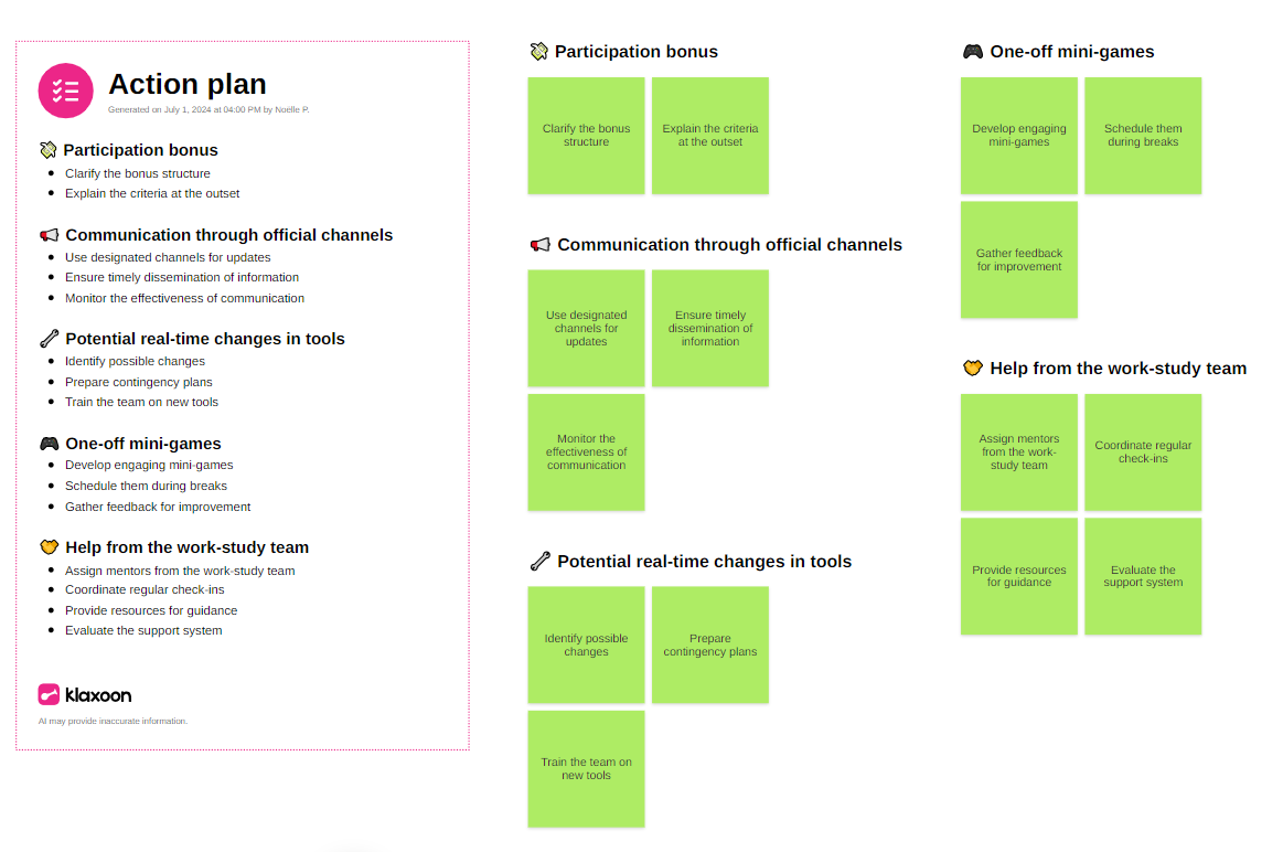The AI will take into account all the texts entered in the ideas, text objects, shapes, connectors, icons, images, areas with titles and the objectives of the selection Board to propose, point by point and in around 200 words maximum, an action plan relating to the texts analysed.