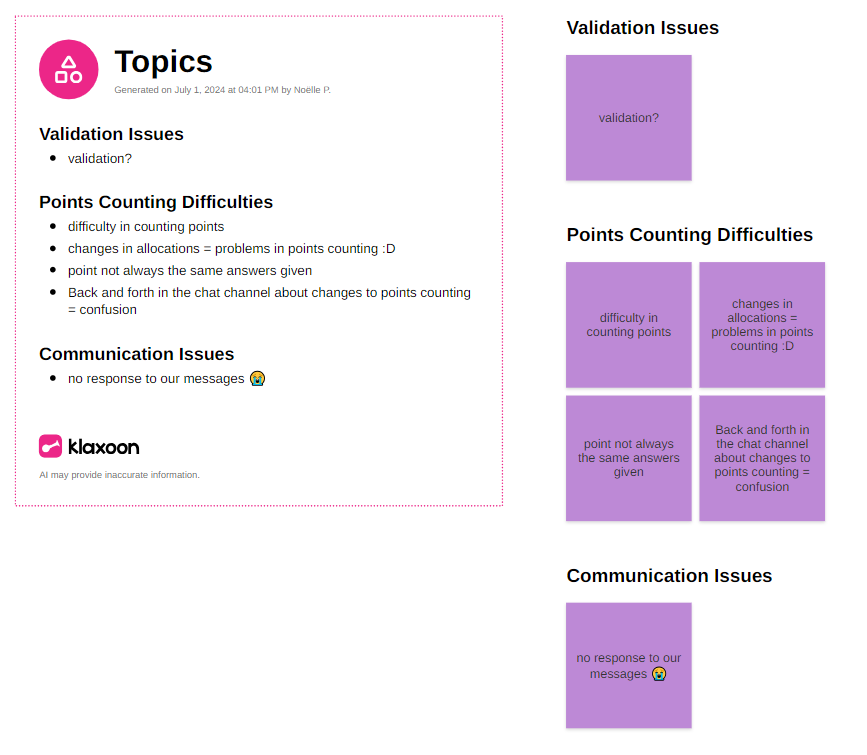 The final object generated by the AI is a "card" format containing the content of the ideas grouped by topic in a text object, as well as the same grouping of target Board ideas so that they can be quickly used in Board.