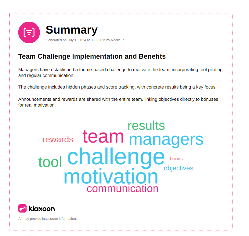 The results generated by the AI and the form templates are in the language determined by the user in Klaxoon, i.e. either French, English or German.