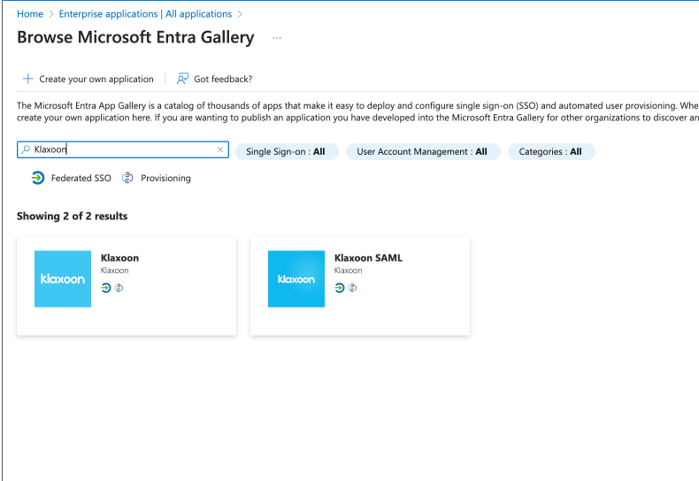 In the search bar, enter “Klaxoon” and choose Klaxoon SAML
