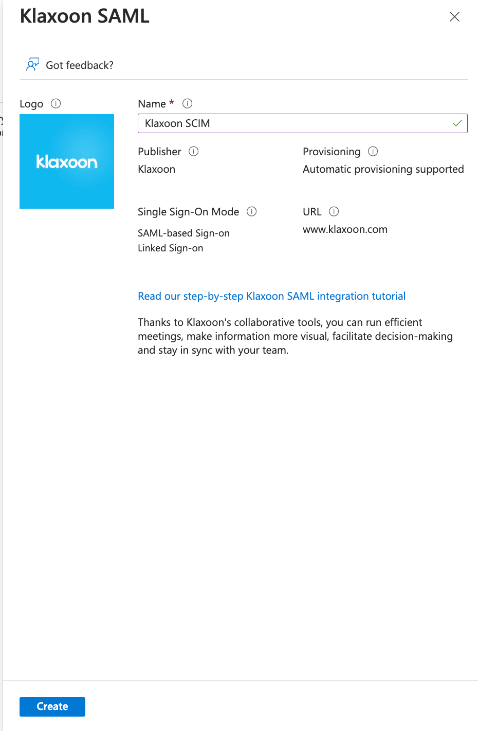 Rename the application to Klaxoon SCIM (or any other name of your choice), then click on Create to create the application.