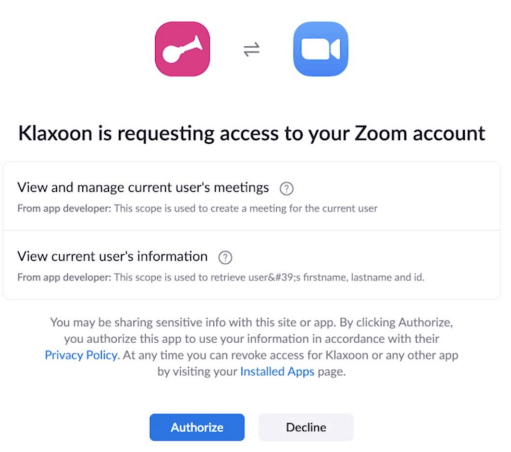 Click Authorize to allow Klaxoon to connect to your Zoom account.