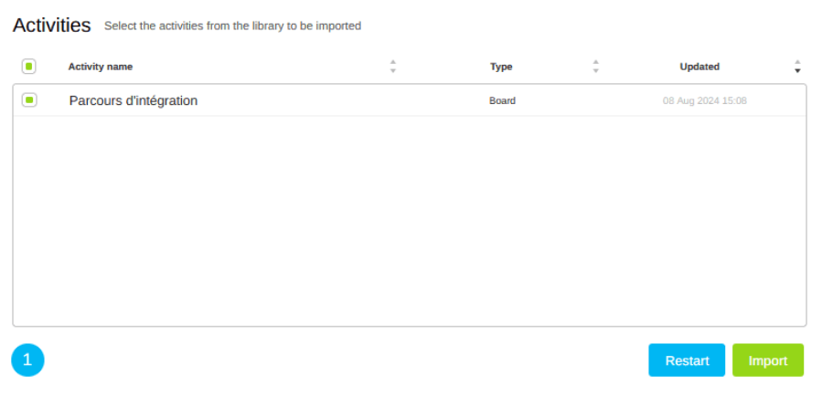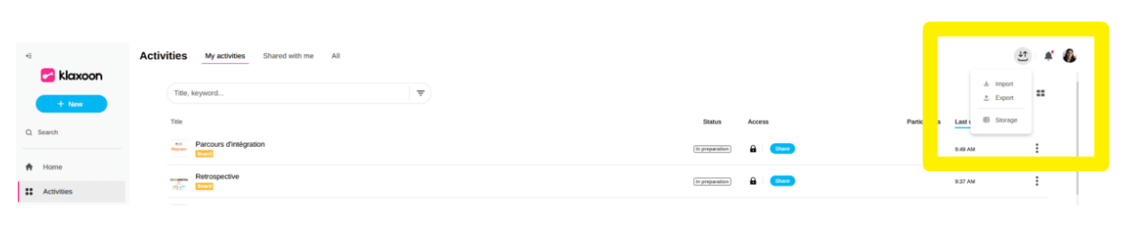From the "Activities" tab , you can import activities as KLX files exported from other Klaxoon accounts.