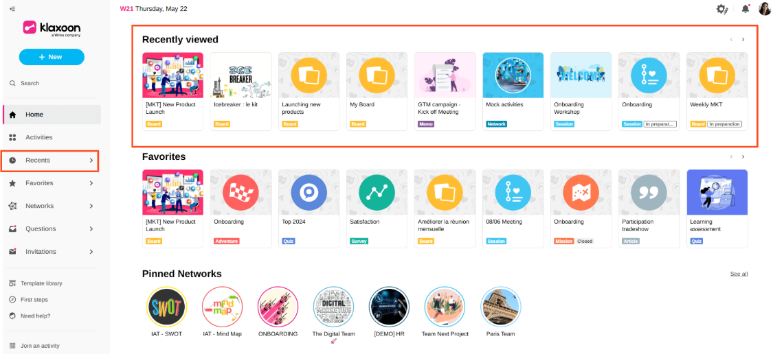On your Klaxoon homepage, the "Recents" section is your best ally. It automatically lists the activities you've most recently opened or edited.