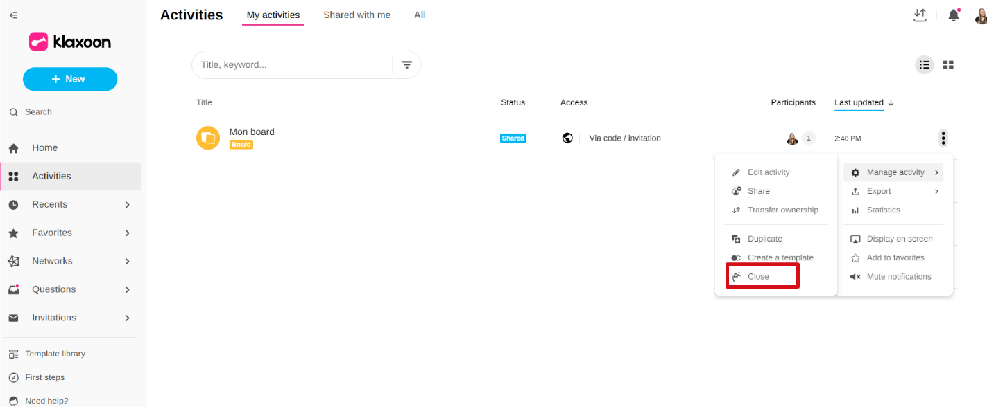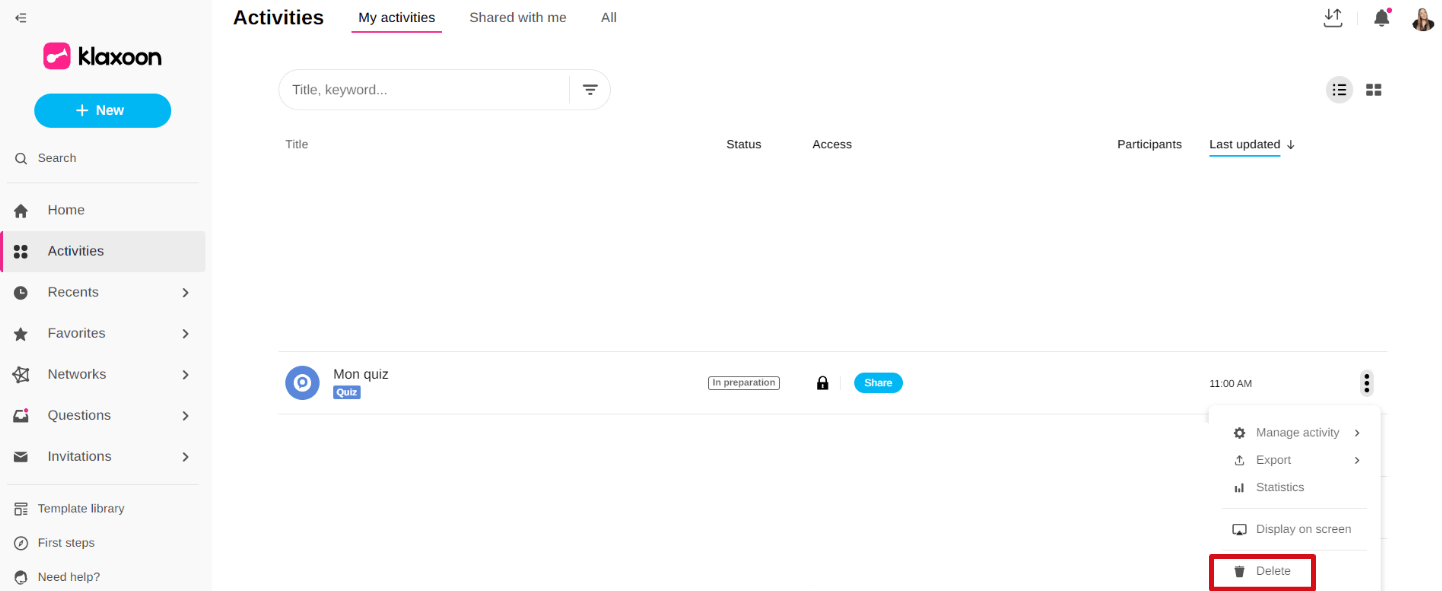 If the activity has not been shared and is still being prepared, you will see the ‘Delete’ option directly without needing to close it.