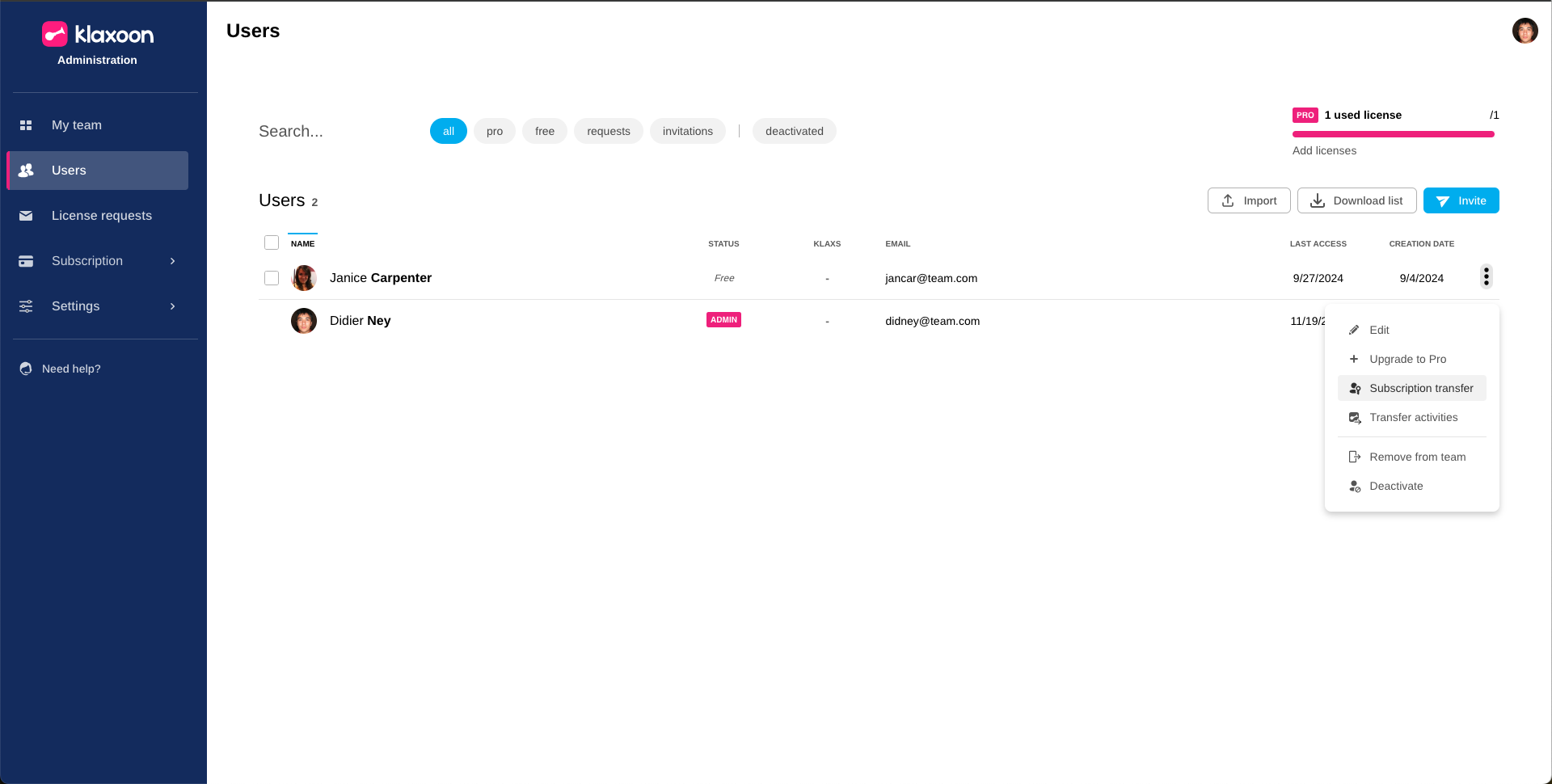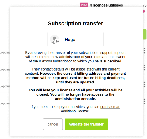 Select the "3 dots" menu to the right of the user to transfer the subscription.
