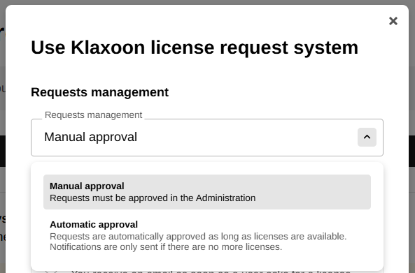 💡 By default, license request approval is in manual mode. The administrator must manually activate automatic approval if desired.