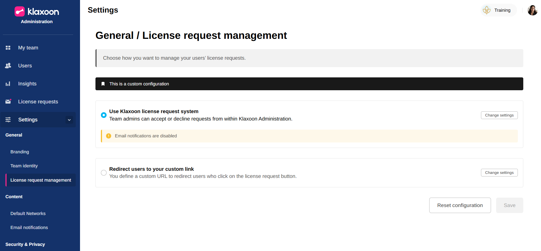 In the left-hand column, click on “Settings”, then on “License request management” and finally on “Modify settings”.