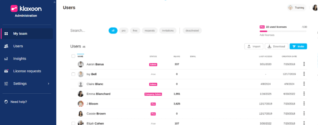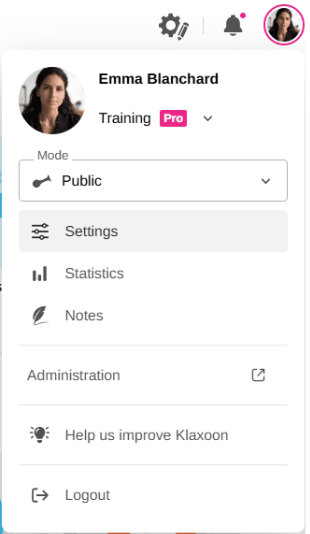 Log in to your Klaxoon account, then click on your profile photo in the top right-hand corner of the screen. In the drop-down menu, select “Administration” to access the administration interface.