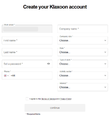Fill in the required fields (e-mail, first name, last name, job title, interests...), accept the Terms of Services and Privacy Policy and continue.