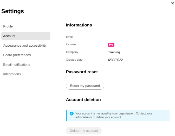 In the menu at the top right of the interface, click on "Settings", then on Reset my password.