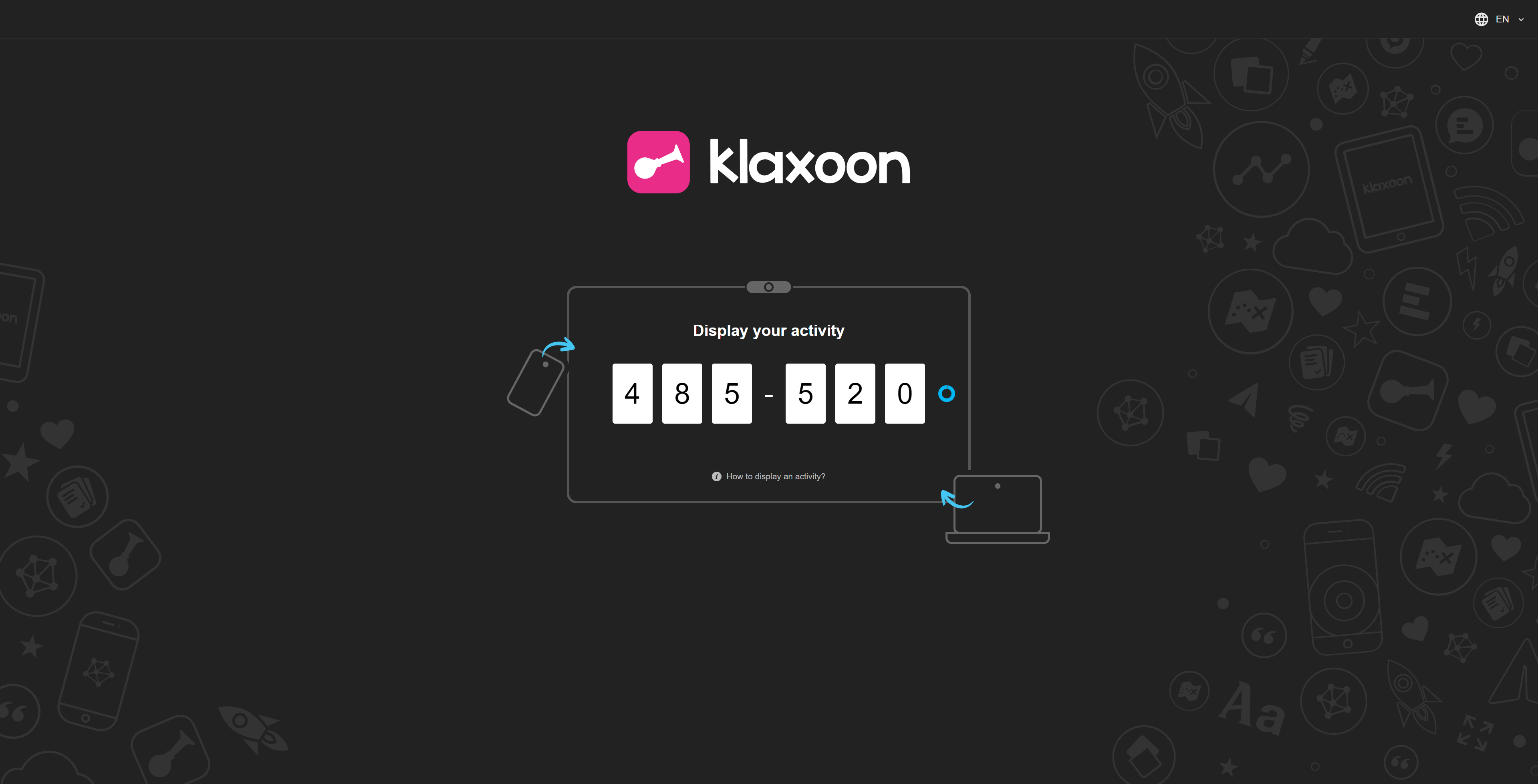 From the big screen, launch the dedicated Klaxoon application if installed, or go to go.klaxoon.com/display. A code appears on the screen, all you have to do is enter the code in your computer or smartphone. The code is updated every 45 seconds.