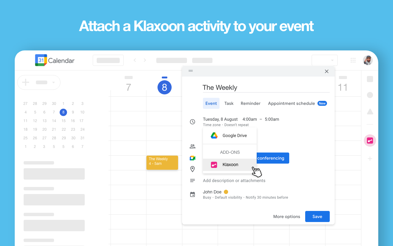 Klaxoon and Google Calendar has a new integration, enabling you to add an activity link as an event attachment when creating and editing an event.