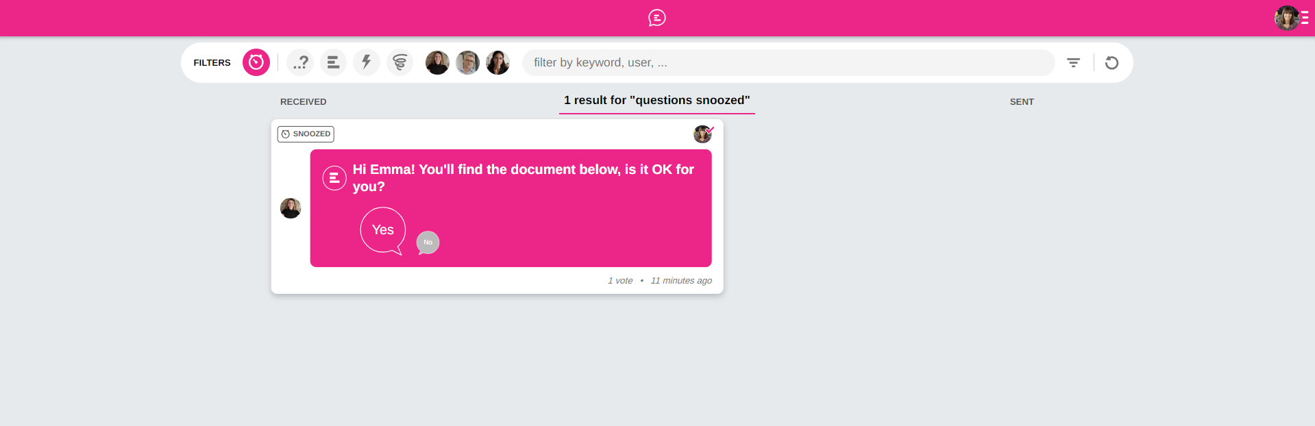 Once the reminder has expired, the Question returns to your Inbox with a pink "Reminder" insert.