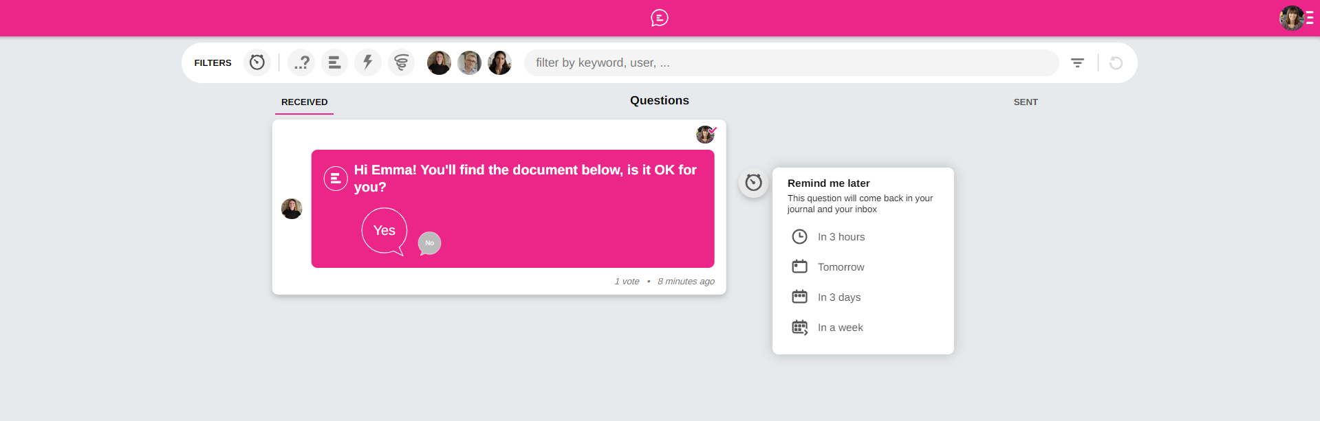 This enhancement will considerably optimize the organization of your Inbox: the /userspace/questions page. Previously, when you had viewed or replied to a Question, it would automatically disappear from the page. Now, with the new "Remind me" function, you can schedule a reminder, ensuring that your Question returns to your Inbox. With this improved and user-friendly function, you'll experience a higher response rate to your Questions!