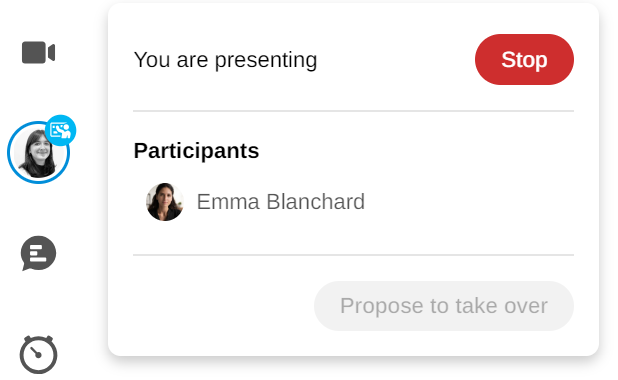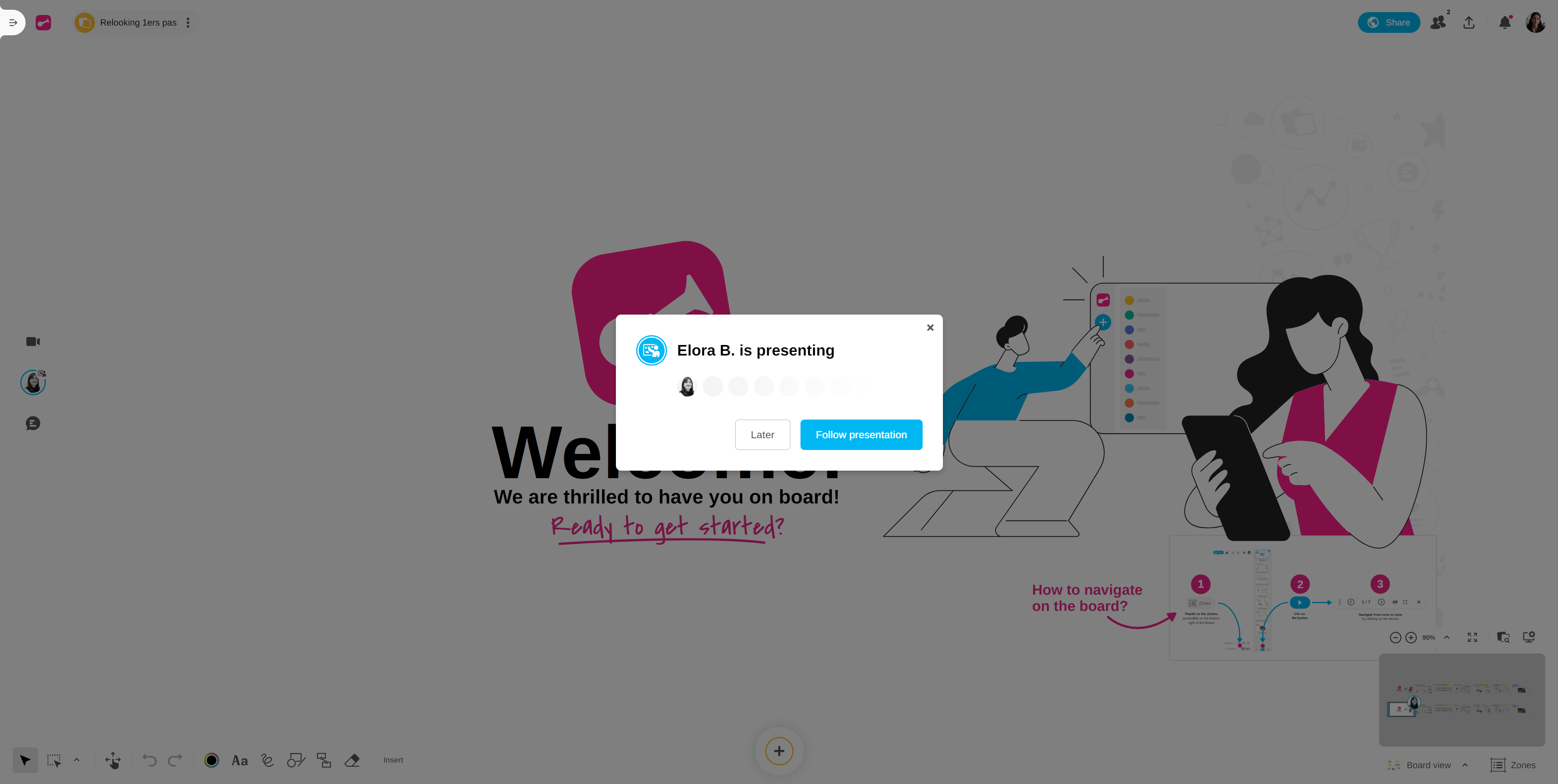 The "Follow me" feature has been renamed "Presentation" and is now more complete and fluid. It's now possible to present the Board view to participants, hand over if a new moderator wishes to speak, and track in real time which team members are following you on the Board.