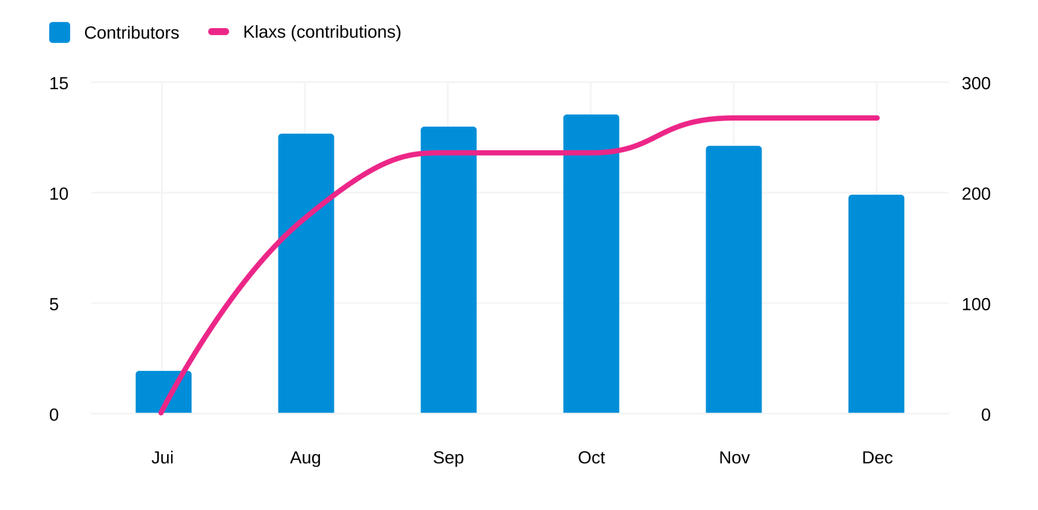 Evolution over time: a graph showing the number of contributors and Klaxs at every stage of the activity's life.