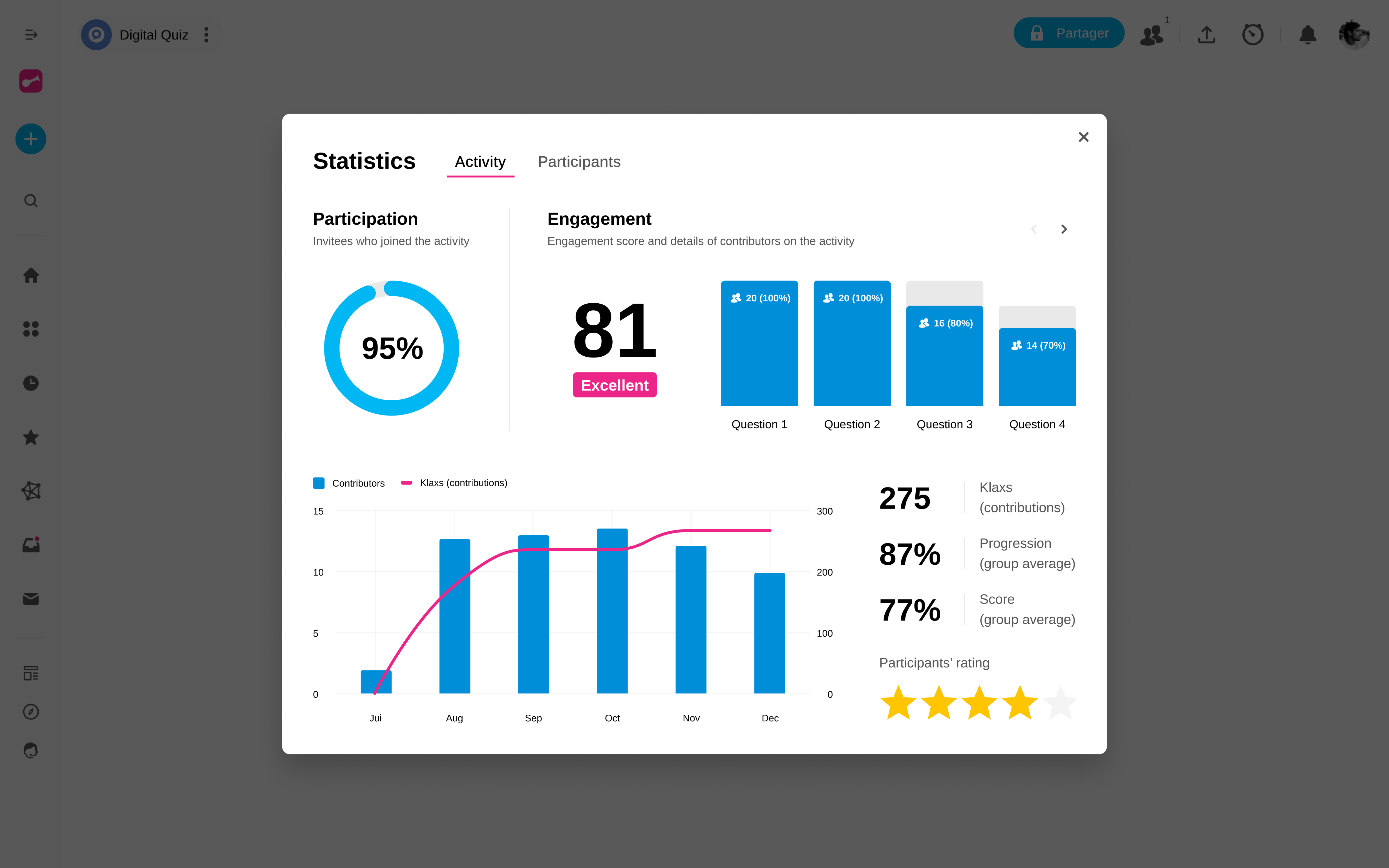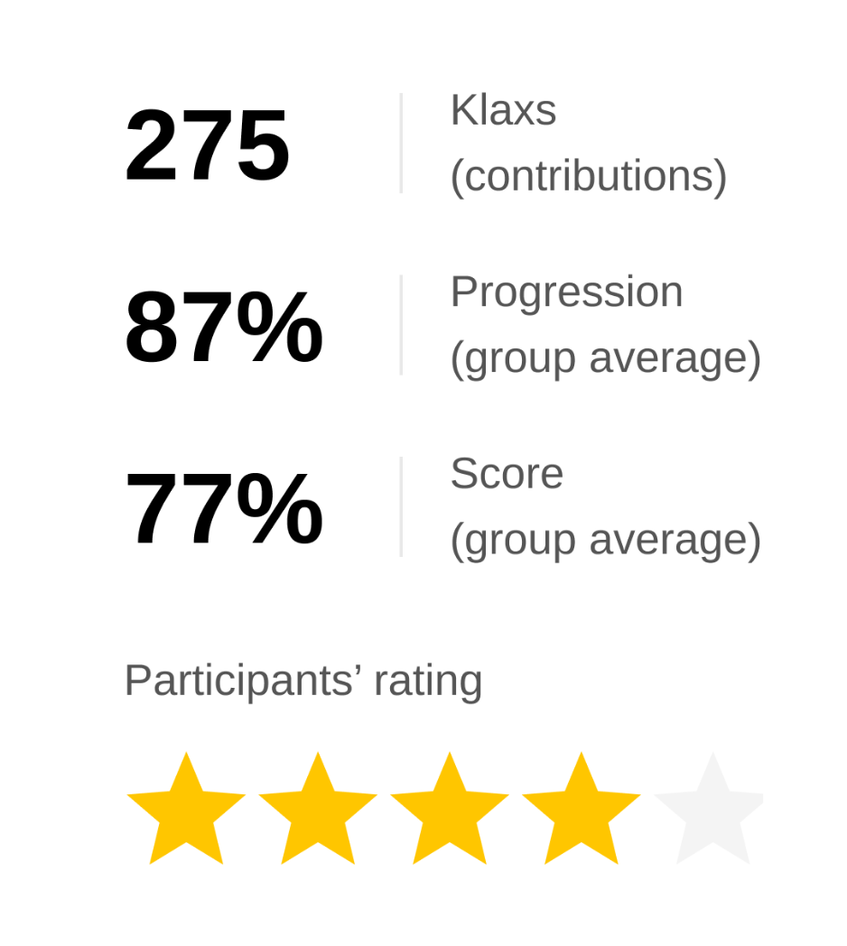 Klaxoon already offers you many features to generate engagement, but how do you measure the impact of your actions? With Statistics, instantly visualize participation rates, engagement levels, and individual contributions across all your activities.