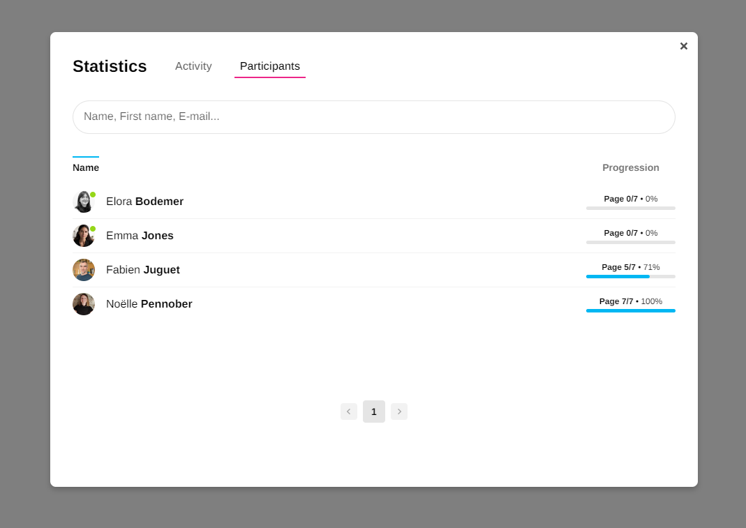 Here you'll find all the data available per participant, depending on the type of activity. For example, for an Adventure, you can access the progress, number of points and score of each participant. For a Board, it's the number of ideas shared. Or, as in the example below, the number of pages read in a Memo.