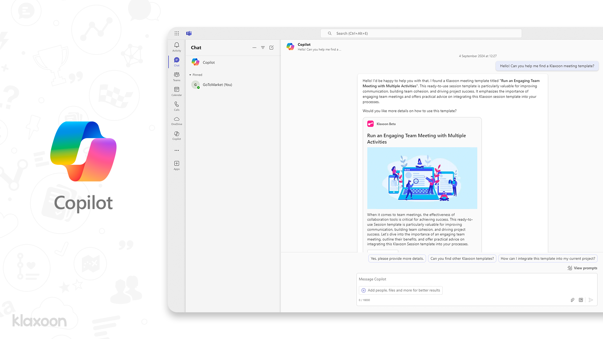 With this new integration, you can now search for your activities in an instant. No more time wasted manually searching for a Klaxoon template or activity you've created. All you have to do is ask Copilot to find them for you, making your day easier!