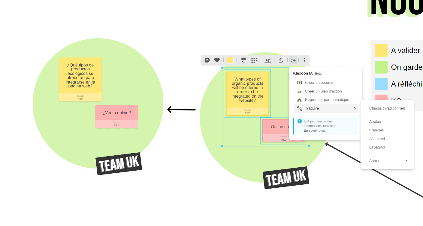 This feature is available since September 19, 2024 for all Klaxoon users. To learn more about the other AI features already available on Board, you can check out this article: Launching AI in Board. You can also contact our Support team from the Chat who will answer your questions.