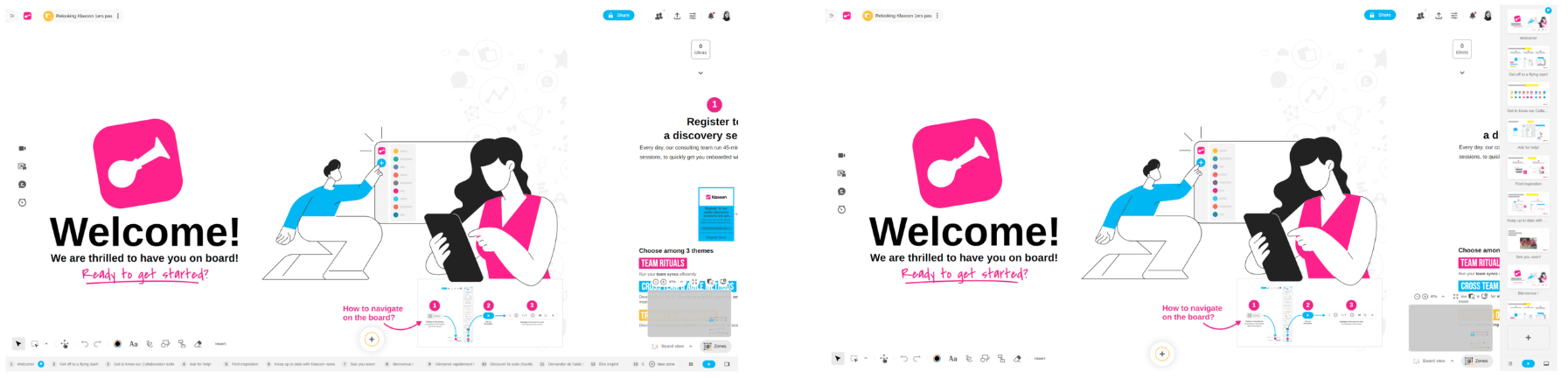 If you're running a face-to-face meeting and want to present Zones on a Board, or if you're exploring a Board on your own and need support in discovering it, this feature is for you! You can now present Board Zones more fluidly with Slideshow mode, while maintaining the unique interactivity that sets Klaxoon apart. Scroll through your zones easily and comfortably via a moveable "widget" (navigation bar). Choose between vertical and horizontal navigation modes, and between list and preview views.