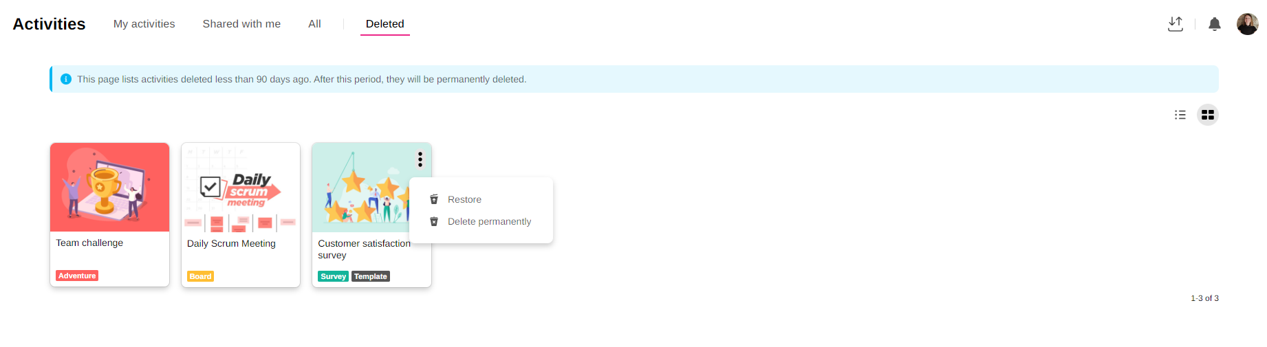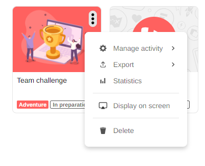 When you delete your activity, go to the "Activities" tab in the navigation bar on the left and click on the "Deleted" tab. You will then see the list of all the activities that have been put in the trash. To restore or delete an activity, click on the three dots on the right and select the desired action.
