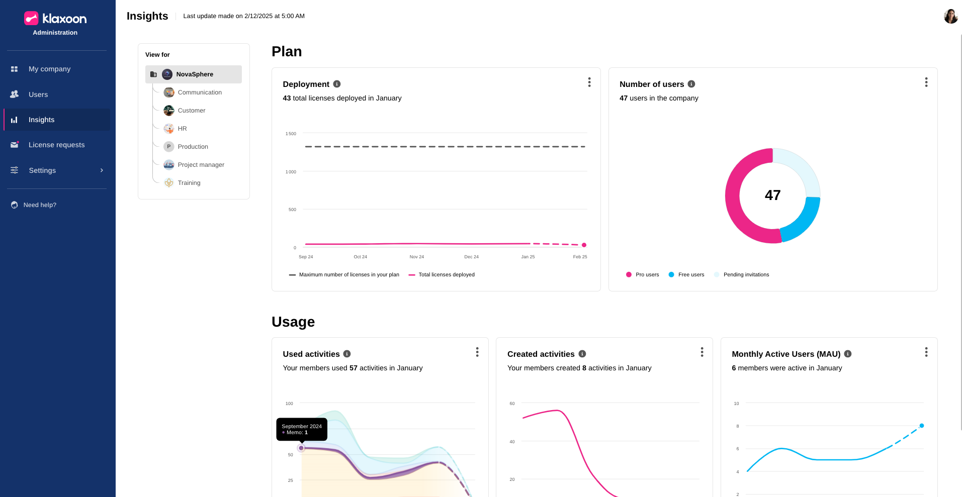 Company administrators : The "Usage analysis" page becomes "Insights" to better reflect the wealth of statistics available.