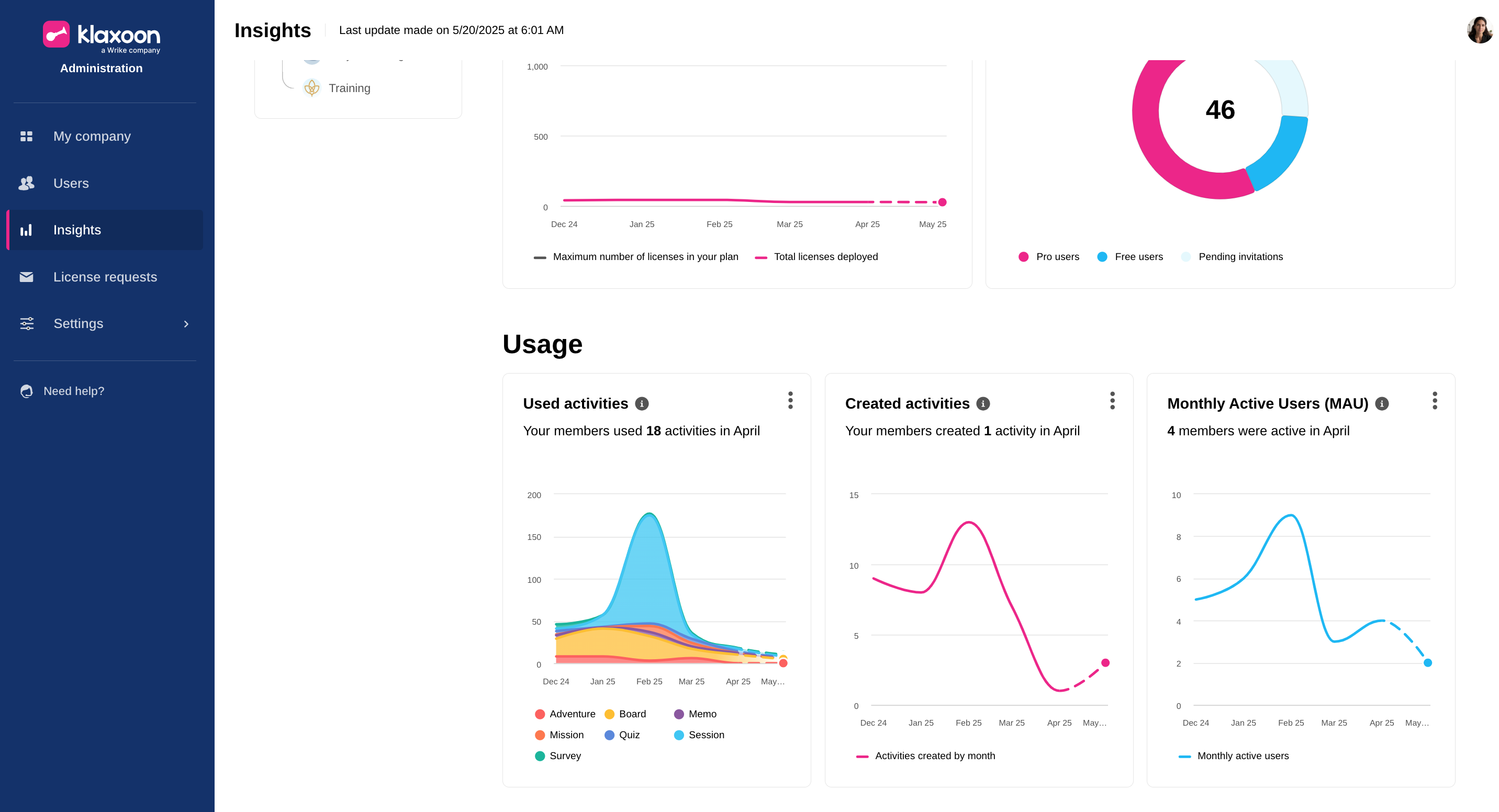 This feature has been available since May 13, 2025 for all Klaxoon administrators. If you want to learn more about the Admin Console, you can check out this article: "Access more data in the Admin page". You can also contact our Support team via the "Need Help" button