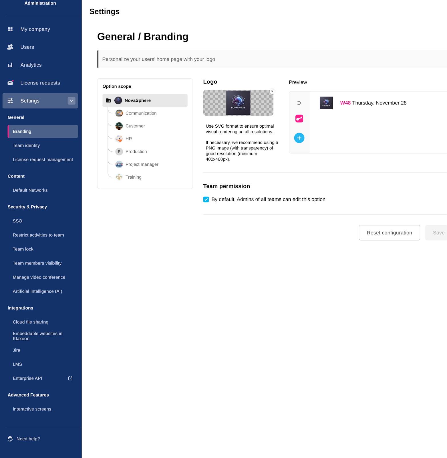 The "Manage my company/team" tab now becomes "Administration". Accessible from your profile menu, it opens the admin space in its own tab. Simply close the tab when you are finished to return to the Klaxoon platform