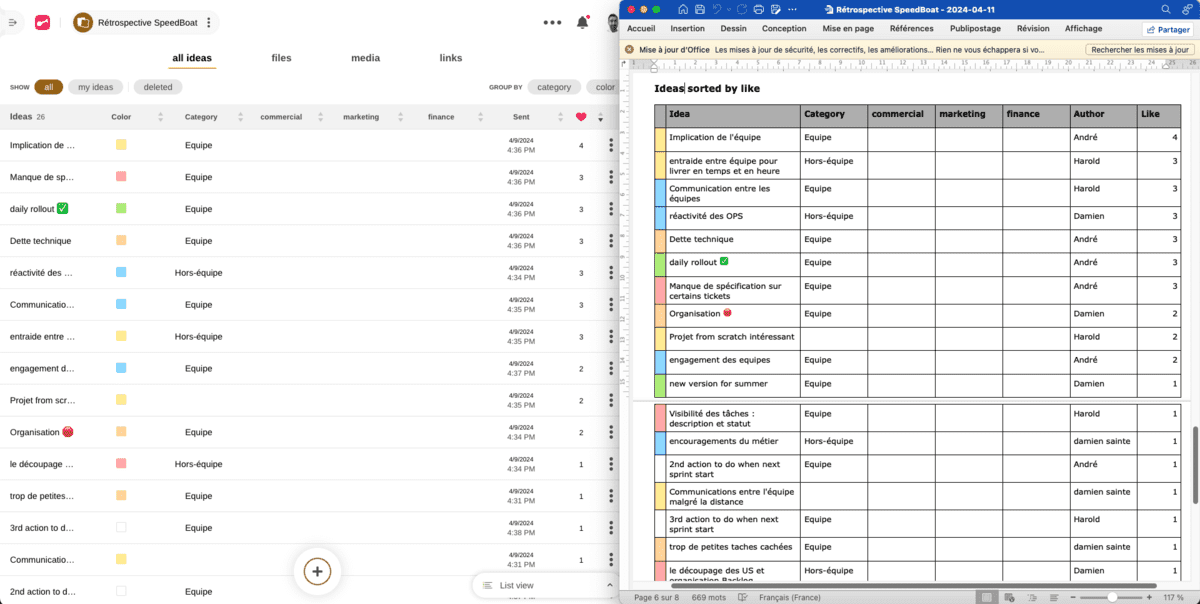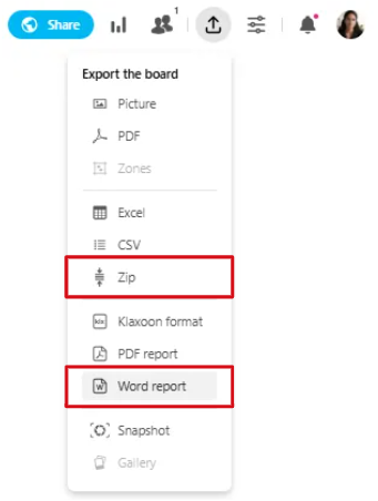 From your Board, as a presenter, click on the export button and then on "Zip" or "Word Rapport" to extract the data from the Board.
