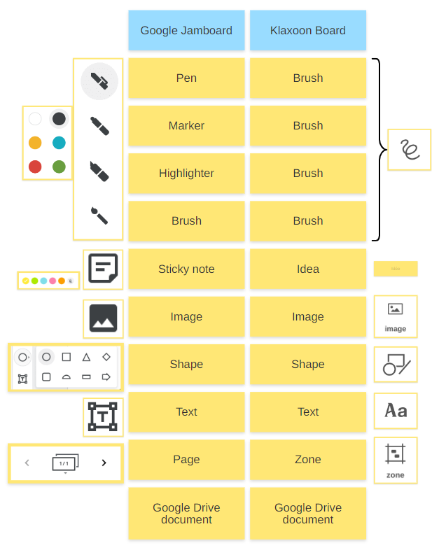 See below for a table of Google Jamboard and Klaxoon Board features: