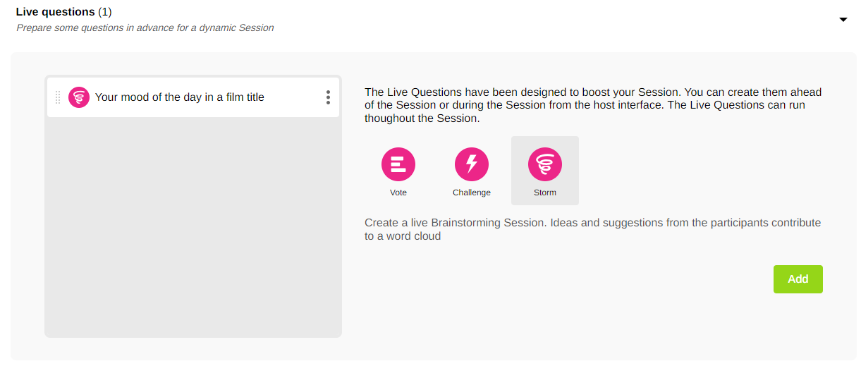 In the “Live questions” area, create a question of your choice, in this case of the “Storm” type.