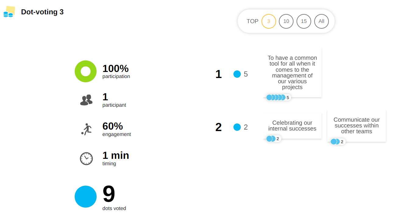 The CSV export of a Dot Voting lists the ideas that have received at least one vote. The aim of this system is to gather everyone's opinions to encourage collective decision-making, while preserving the anonymity of votes.