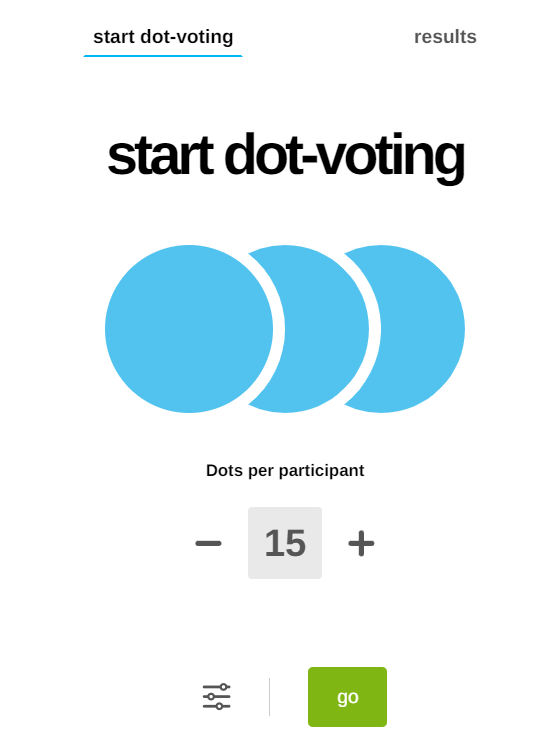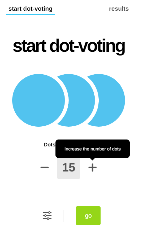 To vote, participants click on an idea, then on '+' to add tokens, or on '-' to remove them.
