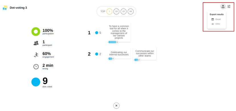 Once the session is over, you can export the results by clicking on the Export button to obtain a detailed voting report. This allows you to keep track of the decisions made, and ensures total transparency in the decision-making process.