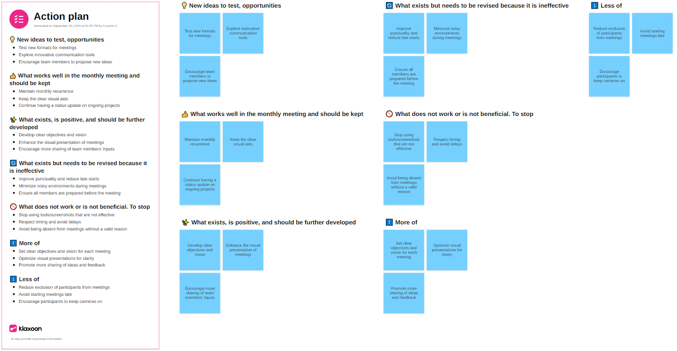 The AI will take into account all the texts entered in the ideas, text objects, shapes, connectors, icons, images, areas with titles and the objectives of the selection board to propose point by point and in a maximum of 200 words, an action plan relating to the texts analyzed.