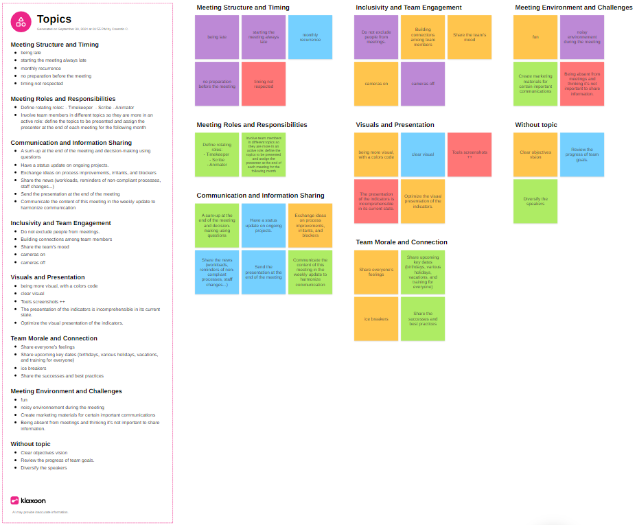 The final object generated by the AI is a "sheet" format containing in a text object the content of the ideas grouped by theme, as well as the same grouping of the target Board ideas to be able to quickly exploit them in Board.
