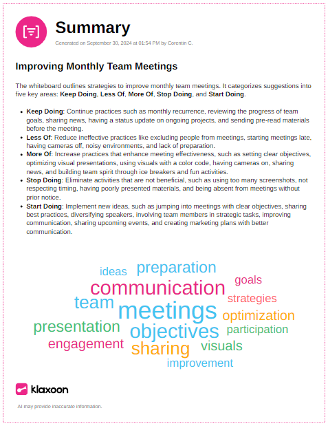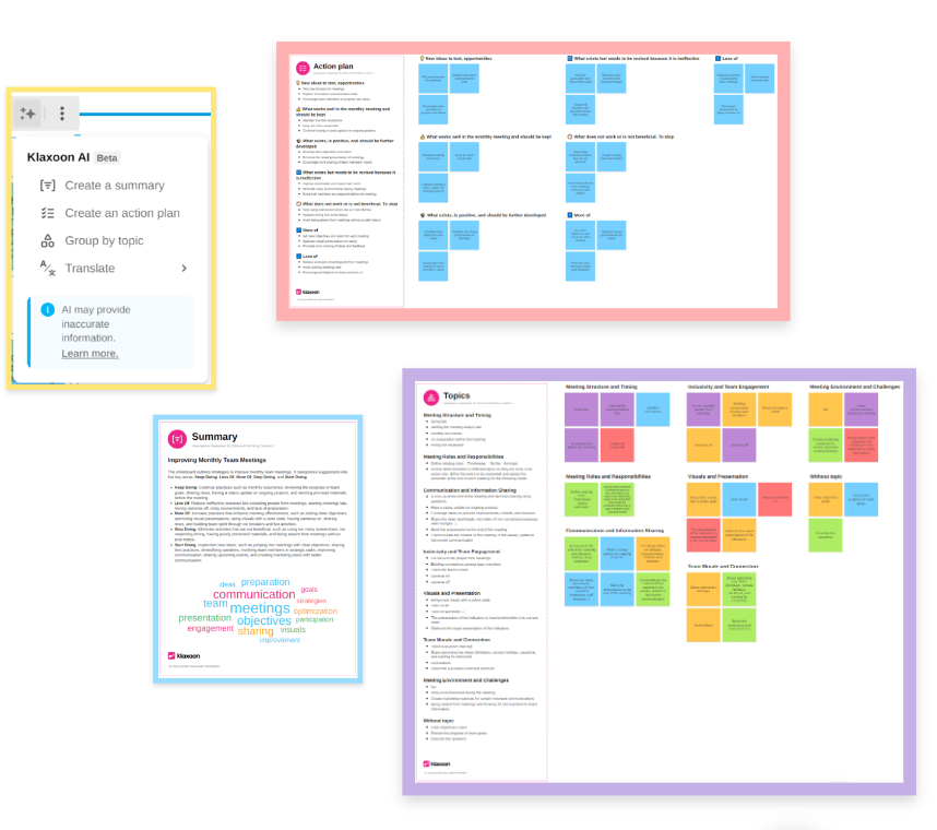 All the power of AI made available to your ideas and texts on Board in order to extract the essentials in a summary, to group them by theme or even action plans to go further.