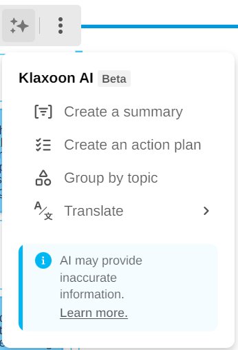The Klaxoon licensing administrator must first enable the AI features in the Console so that all users in your organization can use these new features. Learn more about the terms of use of AI in Klaxoon.