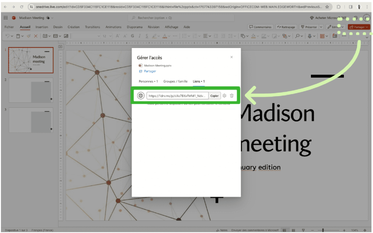 ⚠ From an Office365 document, it is imperative to enter the sharing URL and not the browser URL. The latter will not allow sharing from an idea posted on a Board.