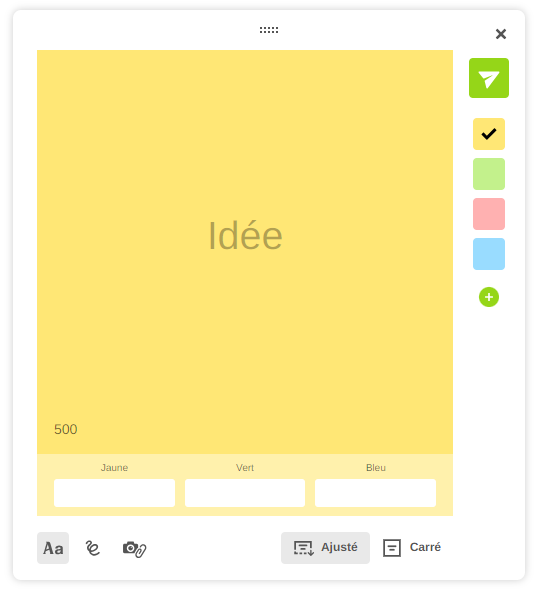Dimensions are used to further qualify ideas. Dimensions take the form of free fields at the bottom of each idea. Participants are free to enter additional details (e.g. first name, date, keyword). The moderator can then use these criteria to refine the sorting of ideas.
