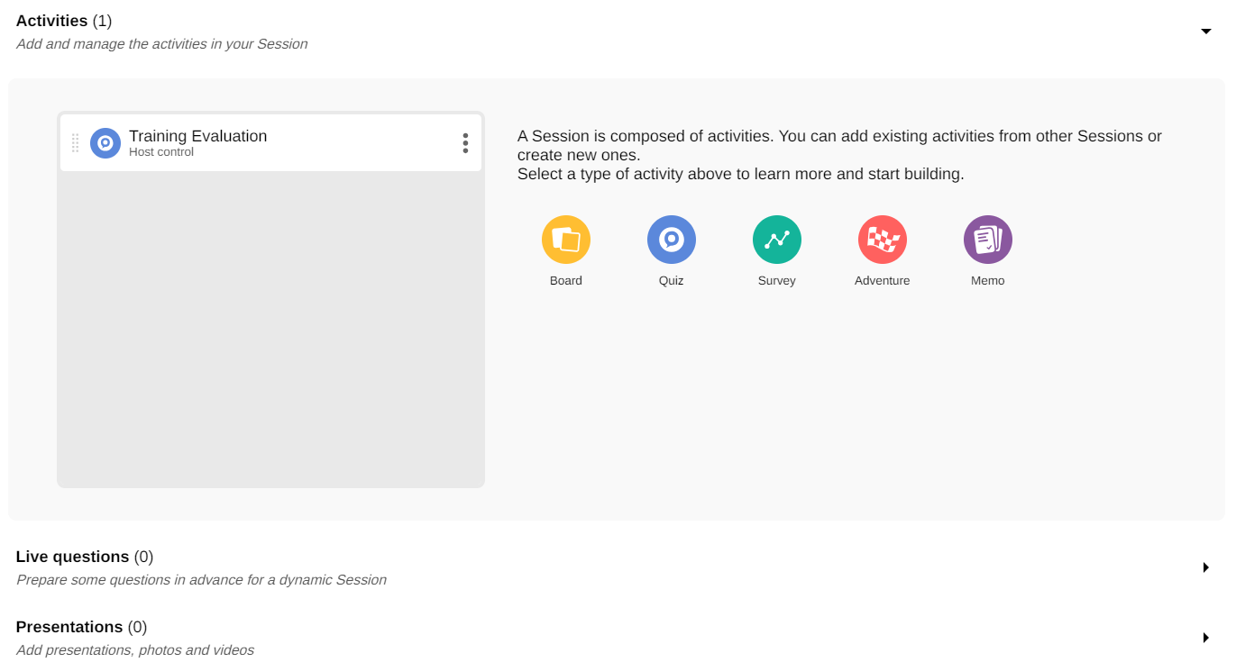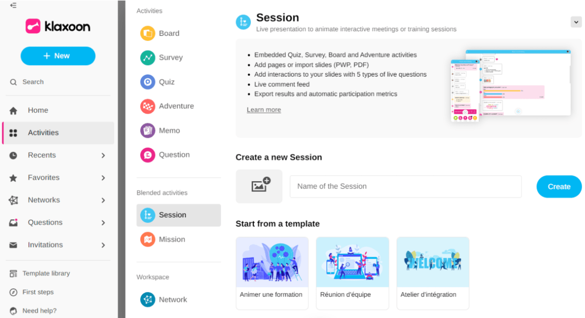 Host-controlled” mode (available only from within the Session) is a powerful Klaxoon feature that lets you control the pace of your activities. This means you can start and stop activities at will, giving you more control over the flow of your Session.