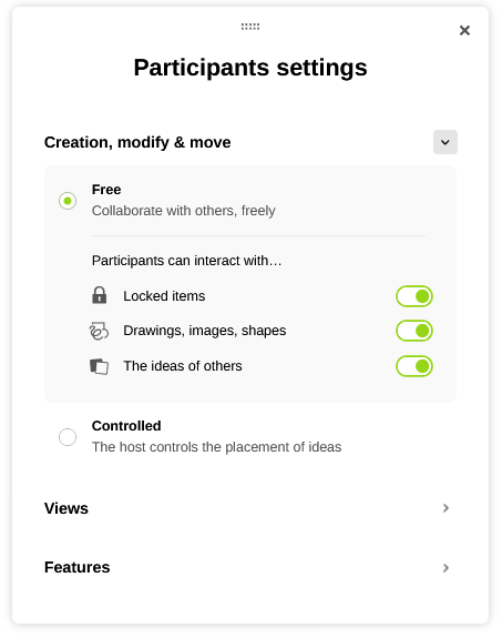 You should check in your options at the top right of your Board, by clicking on the, that in the "Participant settings" box, "Free" is selected. You can also choose if they can act on the drawings, images, shapes, and/or ideas of others..
