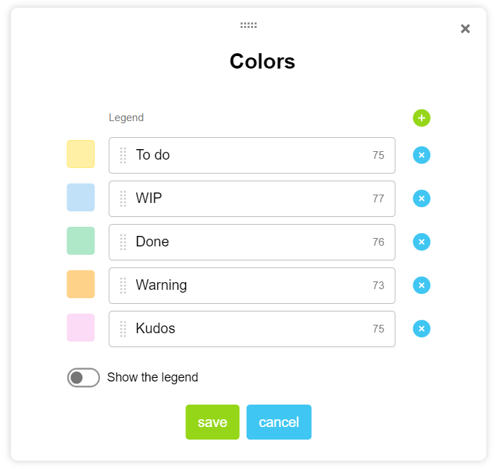 As a Board animator, you can define up to 50 different idea colors. You can do this in two ways: by clicking on the options, or by adding a new idea.