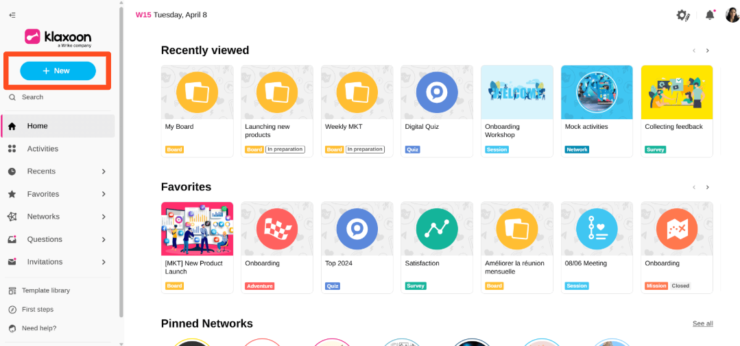 From the Klaxoon Home page, click on "+ New"
