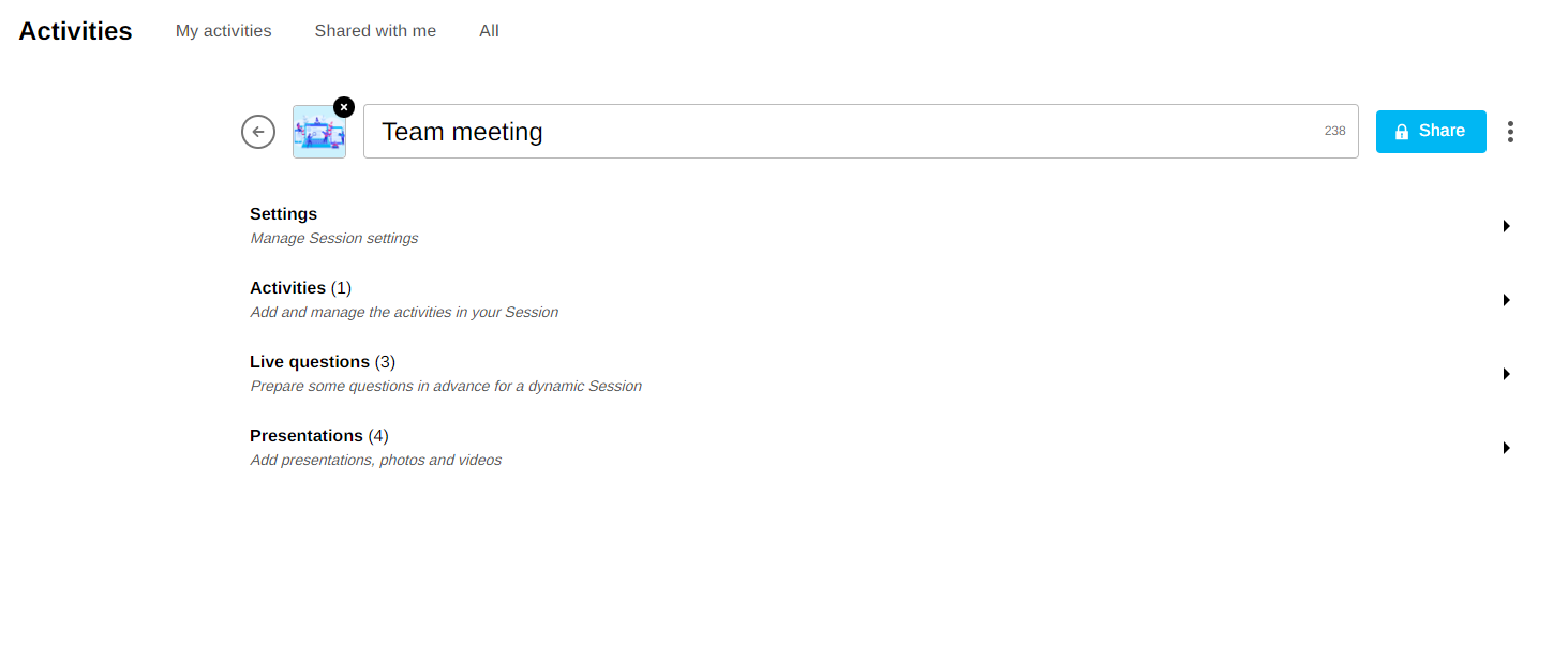Sessions can include various activities such as Adventures, Boards, Memos, Quizzes or Surveys.