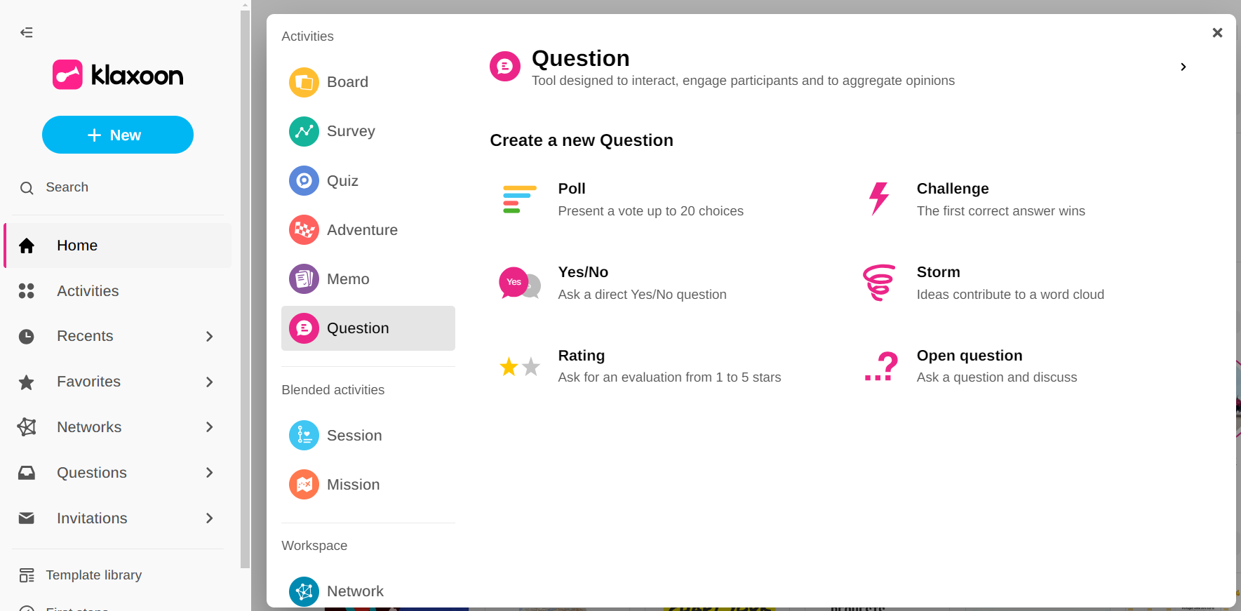 In Klaxoon Home, click on NEW and then on QUESTION.