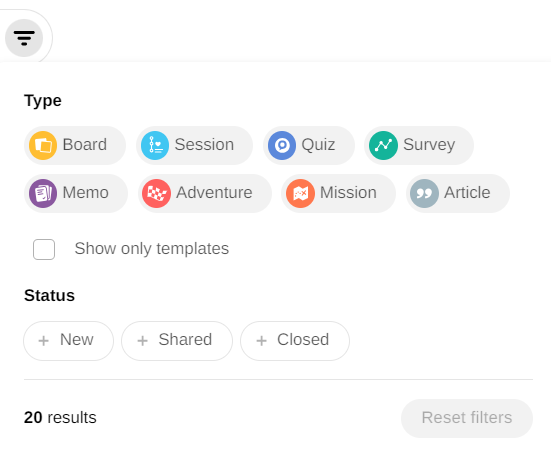 To refine your search, filter the activities by type of activity or by activity status.